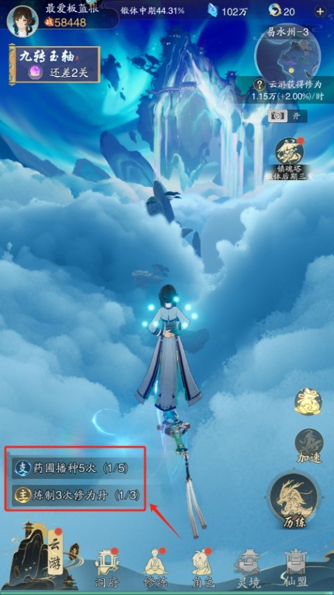 2、完成主线任务获取资源,不断提升修为境界。