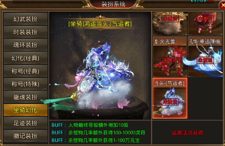 装扮类型丰富多样,包括幻武、时装、魂环、称号、坐骑与足迹等,风格选择自由,满足个性化外观需求。
