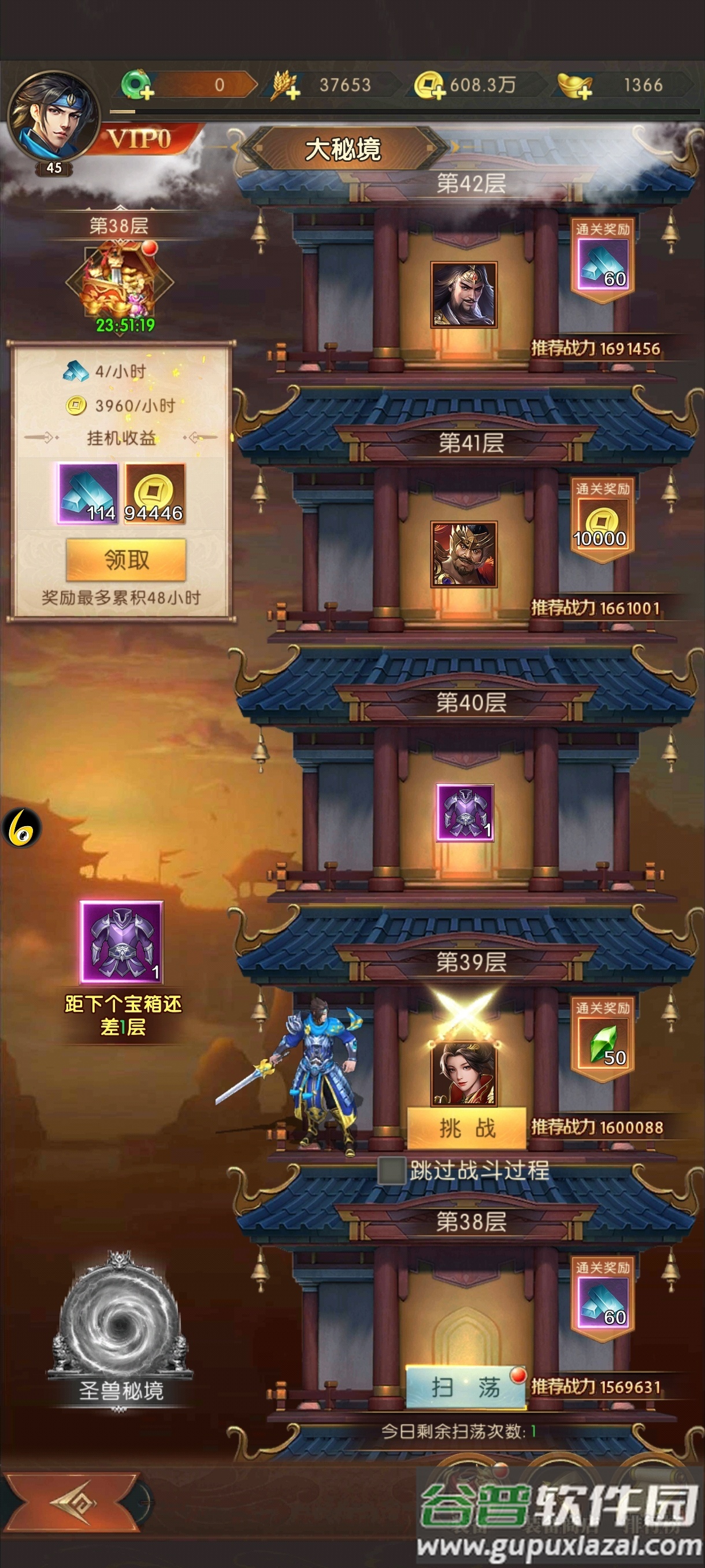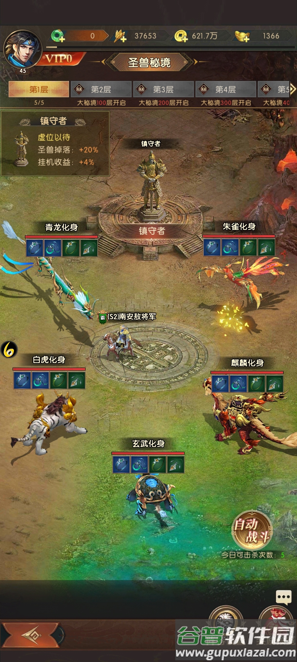 3. 圣兽秘境;爬塔50层后开启圣兽秘境,专门产出首饰类装备,秘境中存在五只圣兽对应装备化身,每日可挑战5次,次数上限为10次;