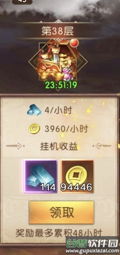 挂机资源在通关30层后开放,可持续获取精铁与铜币,挂机资源最多累积48小时,需及时领取避免浪费;