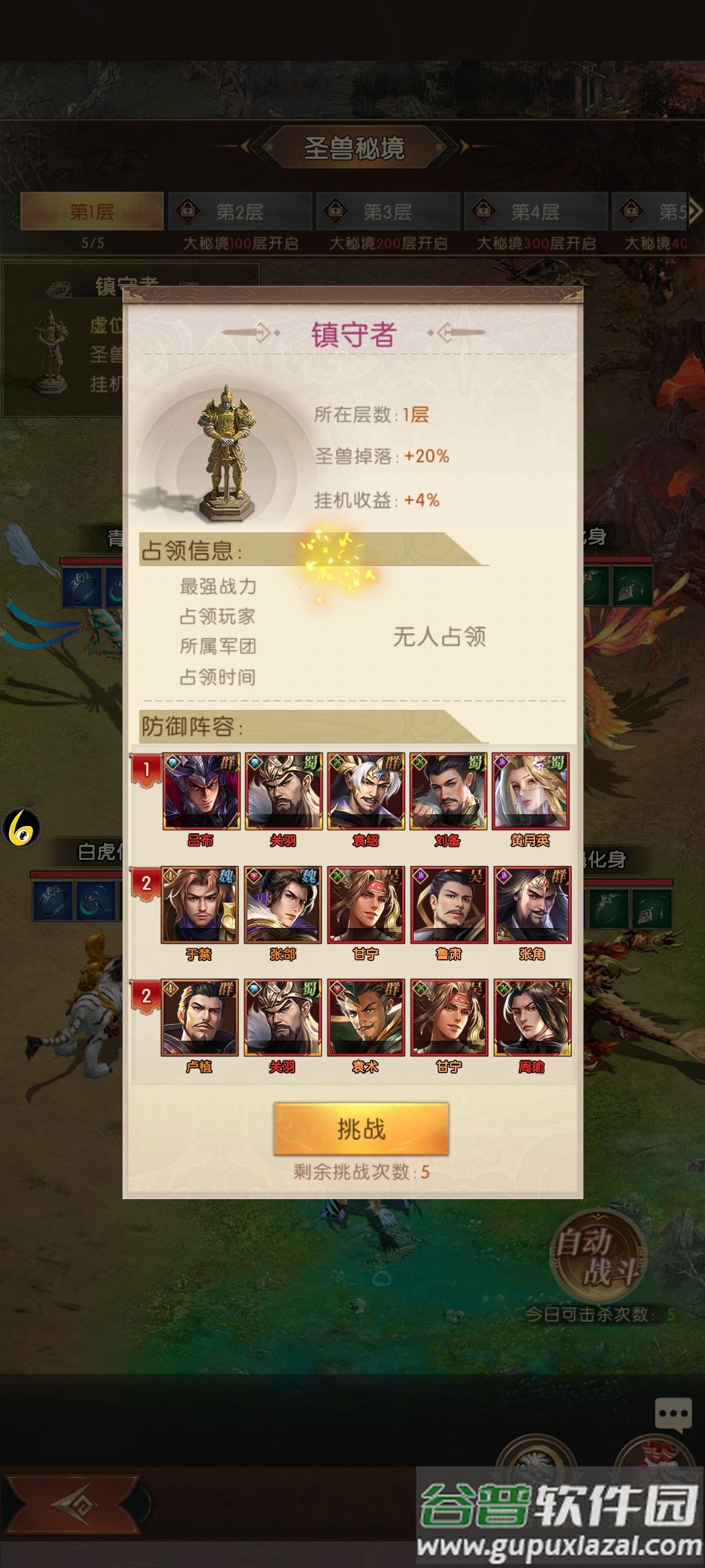 击败圣兽并非必定获得首饰,通过三支队伍协同击败镇守者可提升掉落概率,同时增强大秘境挂机收益,秘境层数越高收益加成越大;