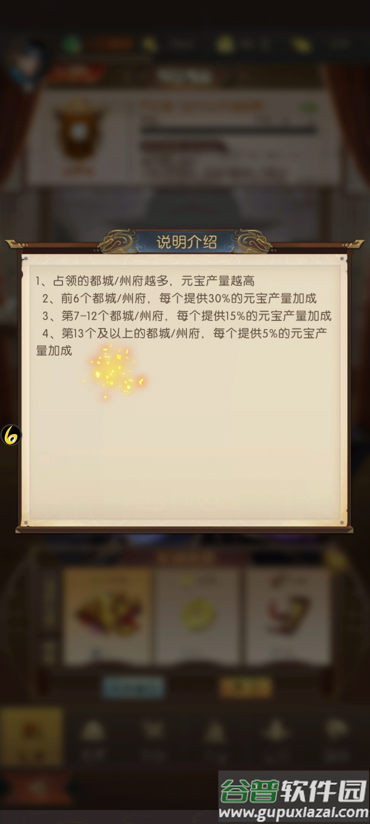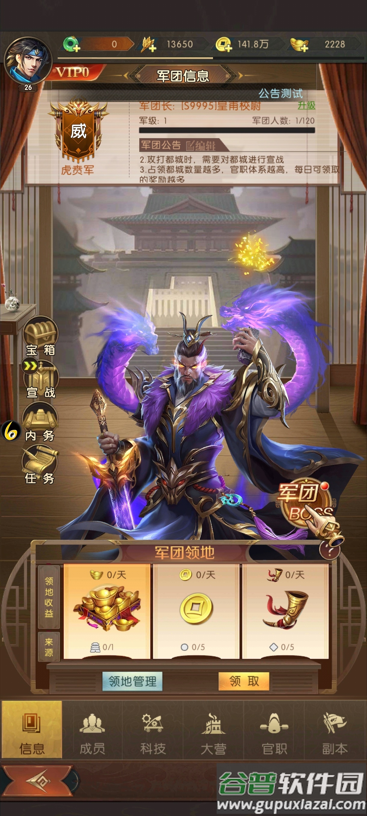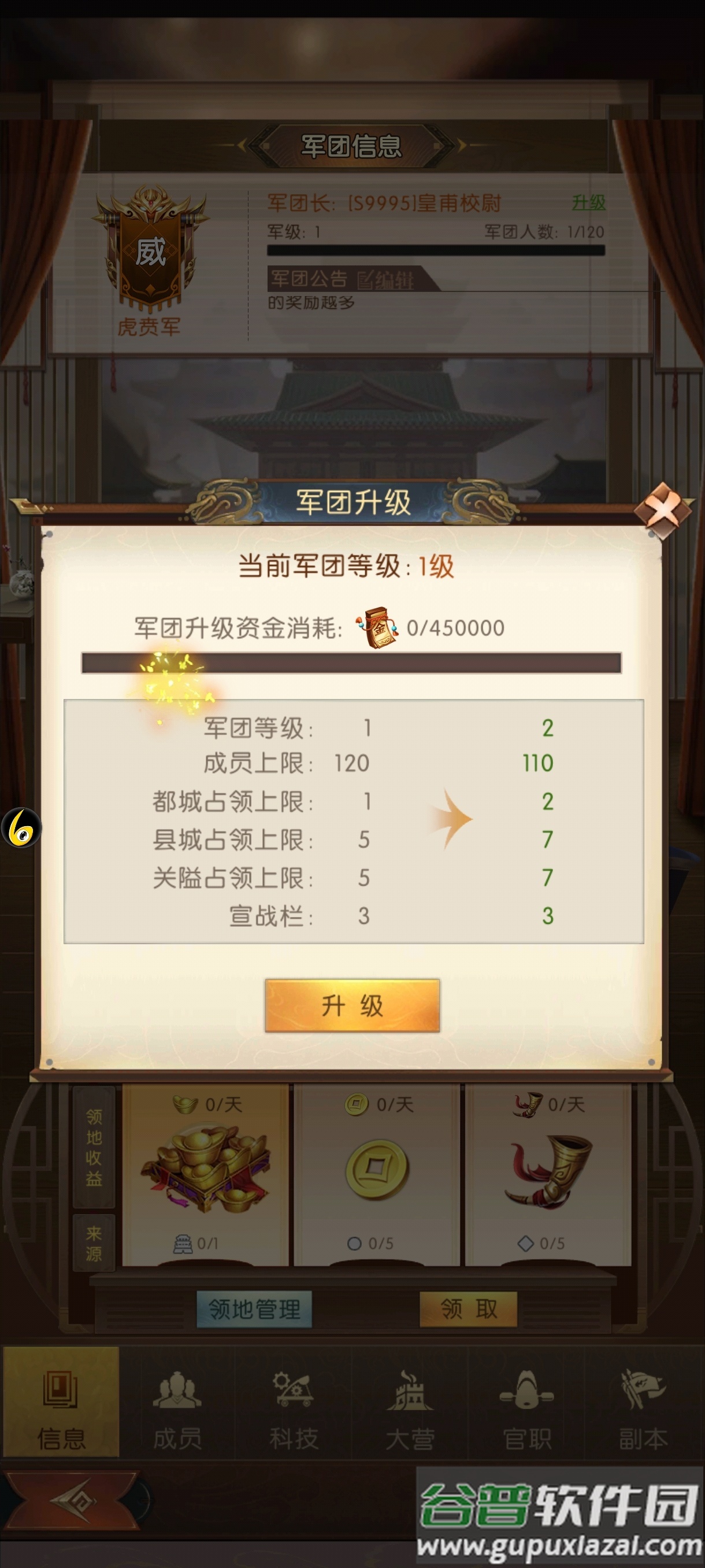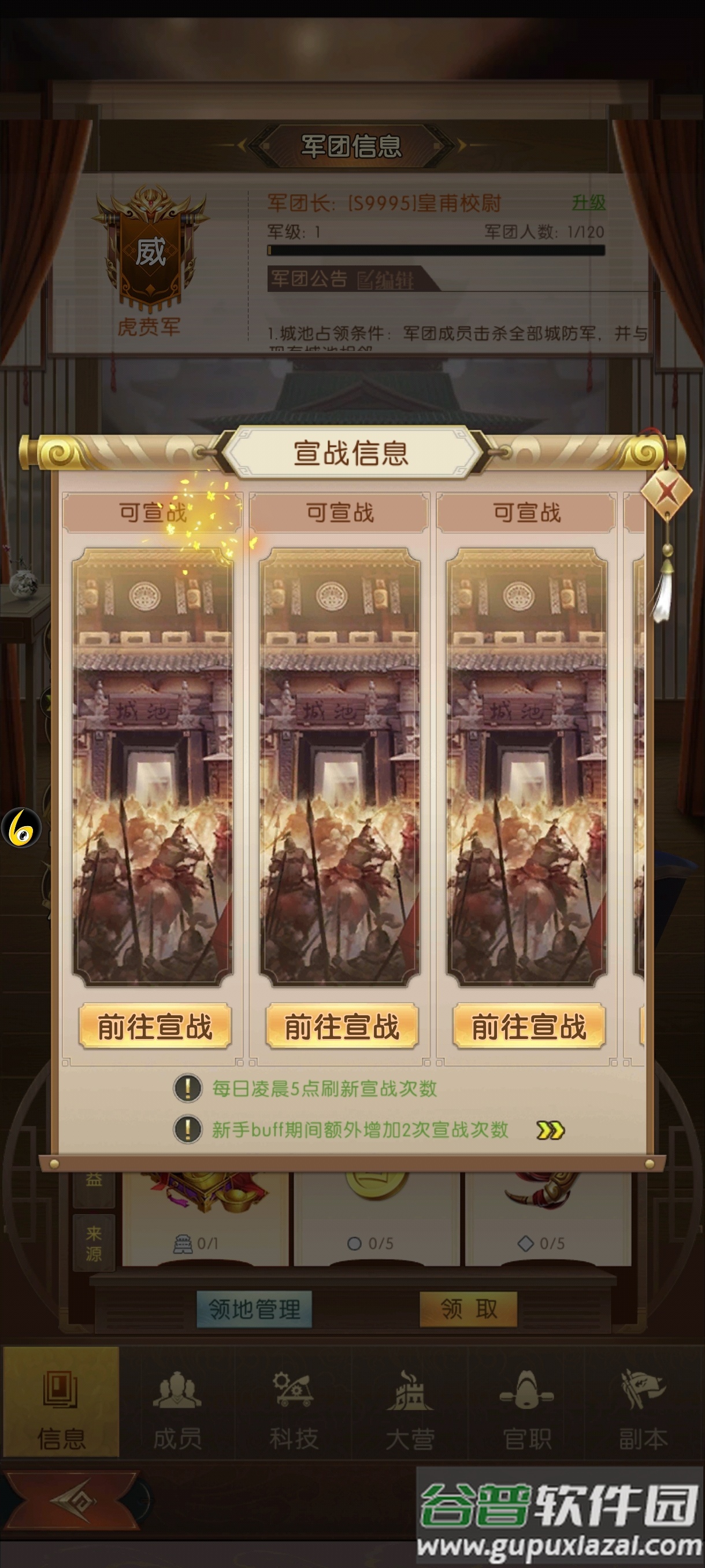 2. 军团城战;军团长与副军团长可对已通关城池宣战,占领城池提供每日资源;成员派遣部队至军团大营驻守,完成首次派遣即视为签到;