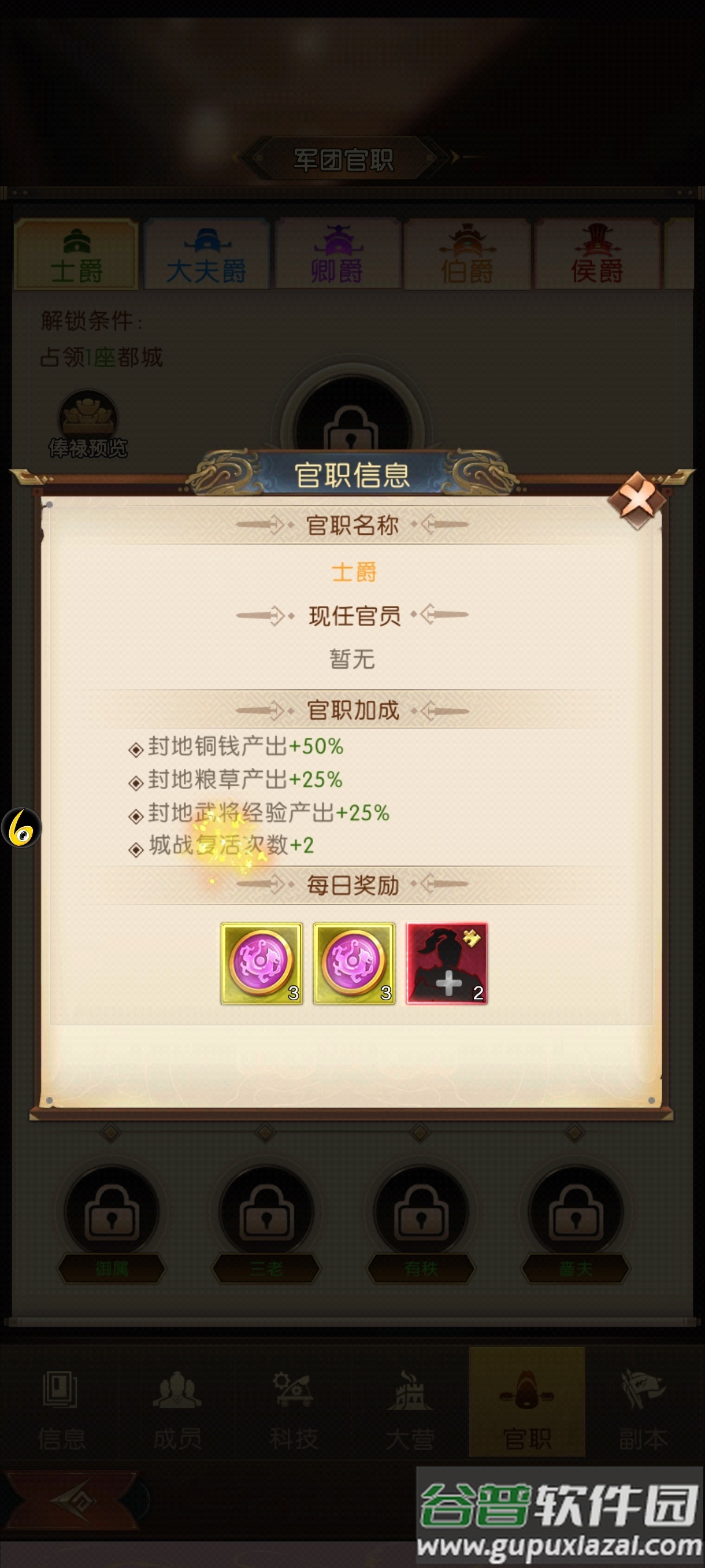 占领都城内解锁官职系统,军团长可分配成员官职,不同官职每日领取不同俸禄,占领都城越多,官职等级与俸禄越高;