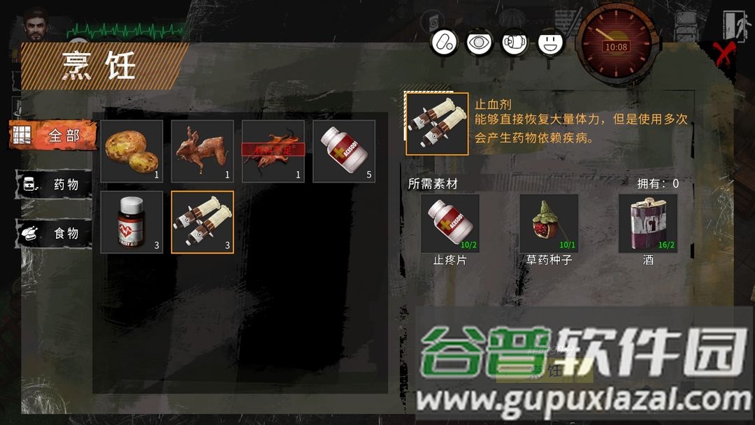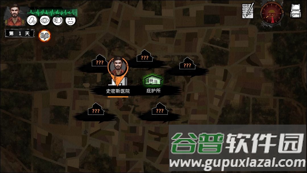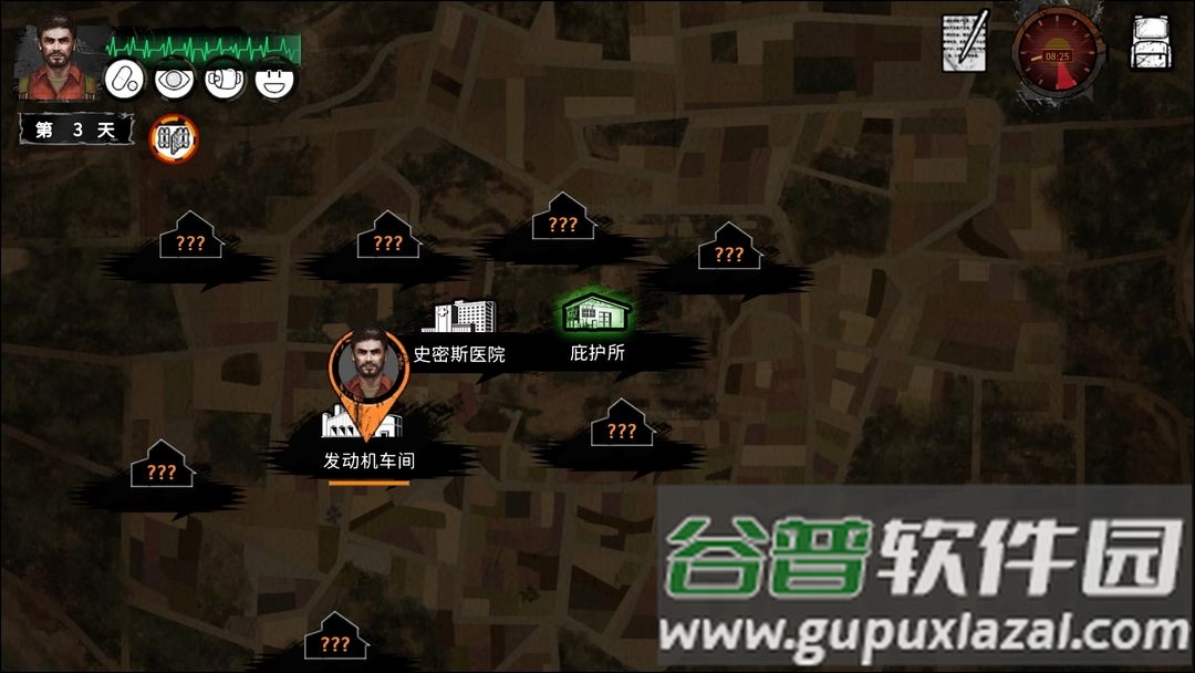 1.初期尽快前往史密斯医院获取药物,男性角色饱食度下降较快,简易烤制食物容易引发胃胀腹泻。注意健康状态,疾病会随时间恶化。同时收集布料与橡胶制作背包,布包足以应对前期需求。