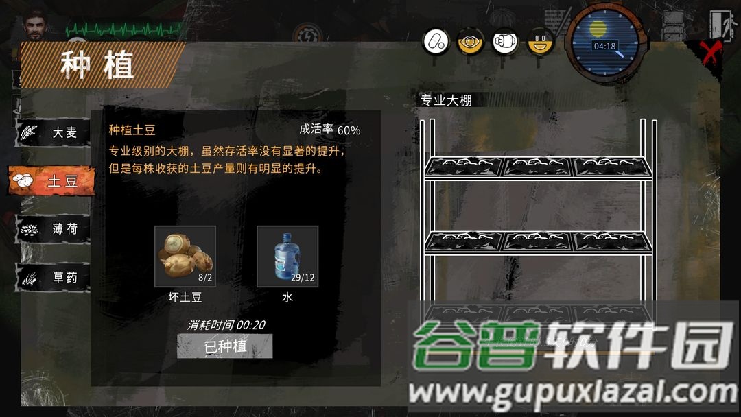 男性角色半月内可建成三级大棚,每三日收获十二个土豆。学习精致烤制技术后食用烤土豆,同步恢复心情与饱食度。