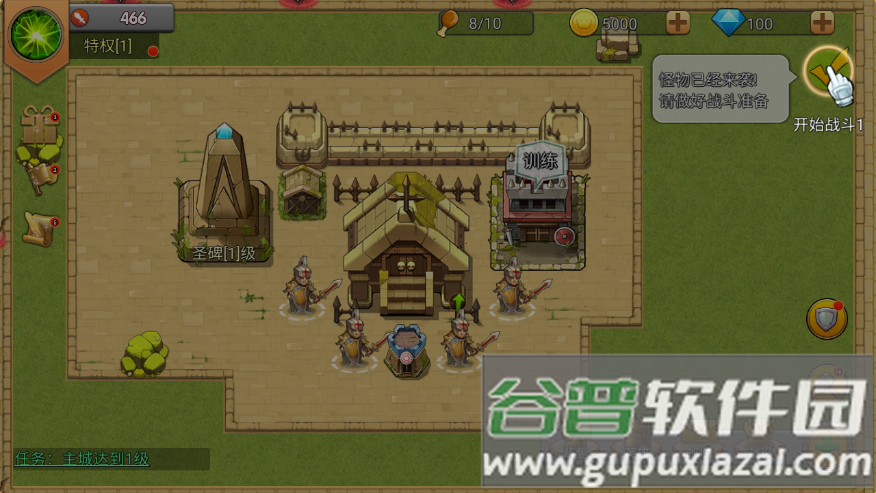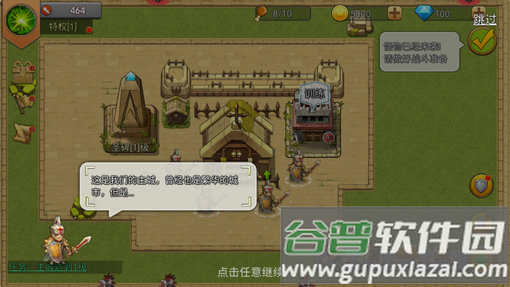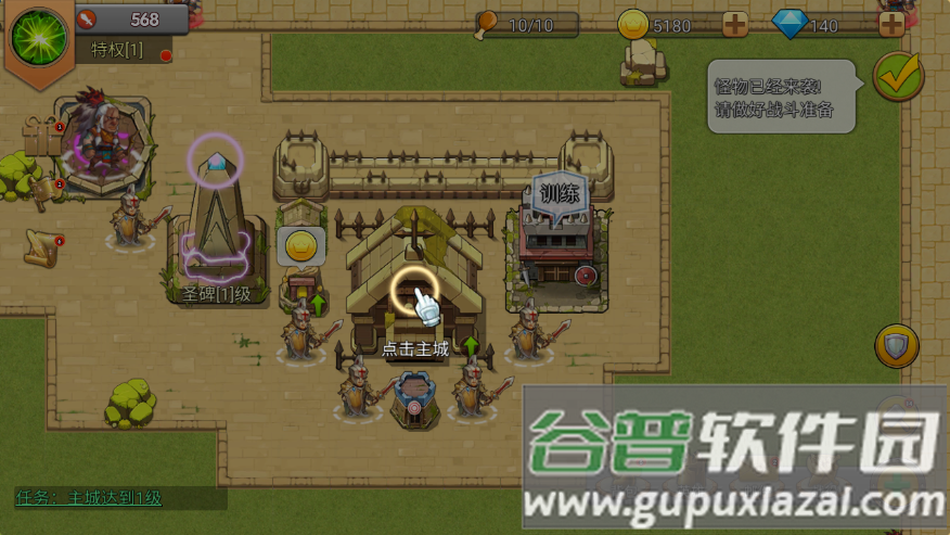 9、升级主城能解锁更多建筑并提升防御,点击主城支付1000金币进行升级;