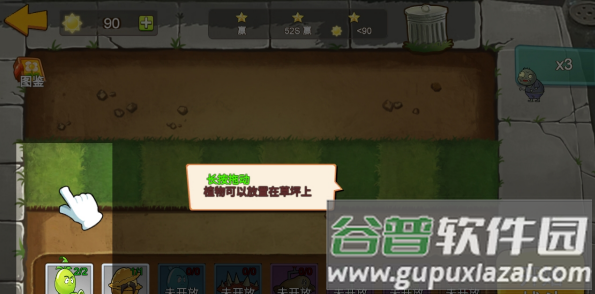 2、进入游戏场景后,长按选中植物并将其拖放至草坪的合适位置;