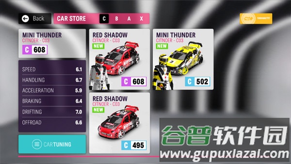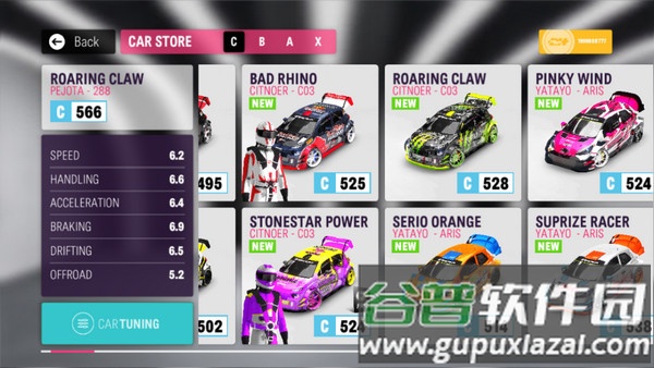 2、CAR store为车辆商店,通过赛事赢得金币后可购置新车;
