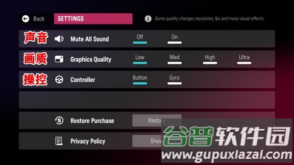 当前版本暂未支持中文,提供音效、画质与操控三类选项,高性能设备建议开启最高画质;