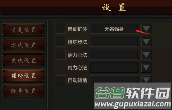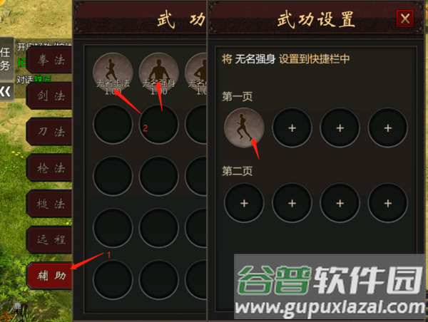 4、开启轻功与护体功能(武功界面-辅助栏启用无名步法与无名强身,建议将步法设为快捷技能);