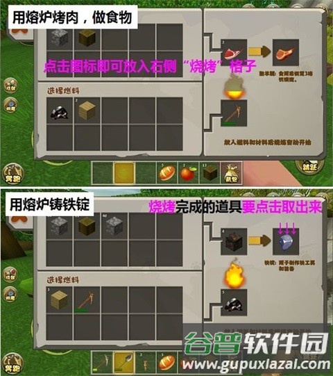 将肉块放入熔炉并添加燃料,等待一段时间即可烤熟。熔炉由石块合成,除了烹饪食物,还能熔炼铁锭、将沙子烧制成玻璃。