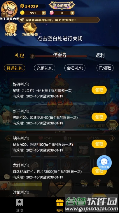 2、点击右上角悬浮按钮可领取各类礼包,快速提升战斗力;