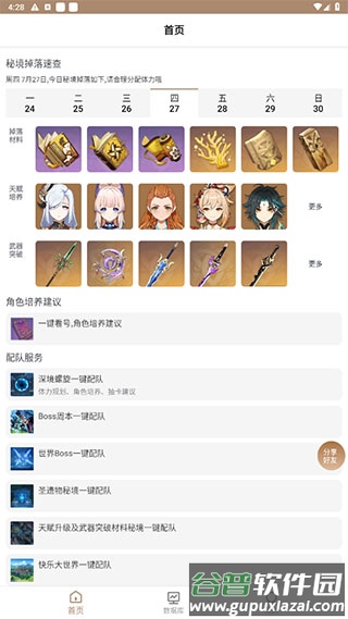 1、启动应用后,首页将展示秘境掉落素材的详细列表与轮换时间,支持查看未来数日的安排,协助玩家合理分配体力资源;