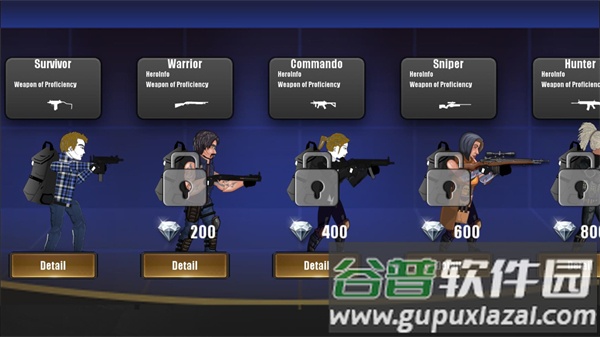 2、有多个英雄角色可以让你去选择游玩,每一位角色都有独特的武器可以让你去选择使用。