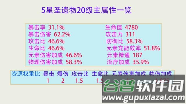 20级圣遗物主属性值为固定数值,各属性之间存在资源权重比例,该比例在同类武器副属性及角色突破属性中保持一致。