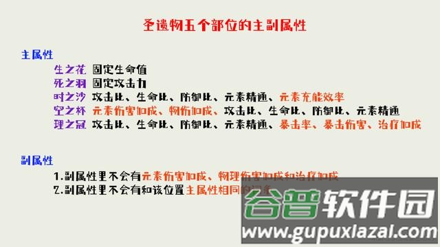 副属性中不会出现元素伤害加成、物理伤害加成与治疗加成,且不会与主属性重复。例如主属性为暴击率的帽子,其副属性中不会再次出现暴击率。