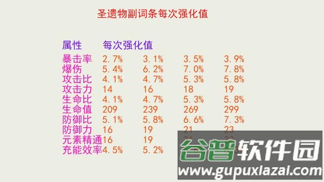 副属性初始值与每次强化值仅有4种档位,具体数值参考下图(实际存在小数位,可能出现0.1左右误差):