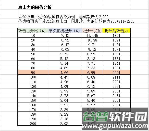 以90级迪卢克配备90级试作古华(基础攻击900)为例,计算单次提升10%攻击百分比的收益变化(暂不考虑小攻击词条影响)。圣遗物2件套效果中,攻击百分比权重略高于元素伤害加成(18%对比15%)。