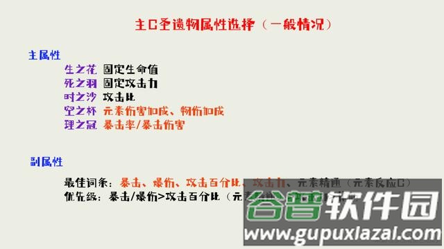 选择圣遗物时需综合评估其主属性、副属性及套装效果。