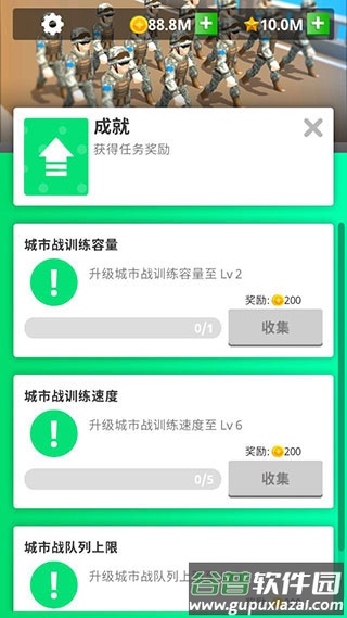 1、每项训练关卡都设计有独特难度,必须完成指定挑战才能提升军队实力;
