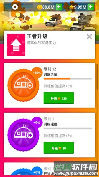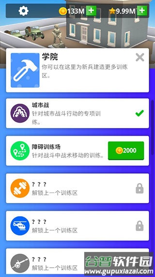 2、初始获得闲置军事据点,通过消耗金币逐步解锁并升级训练设施;