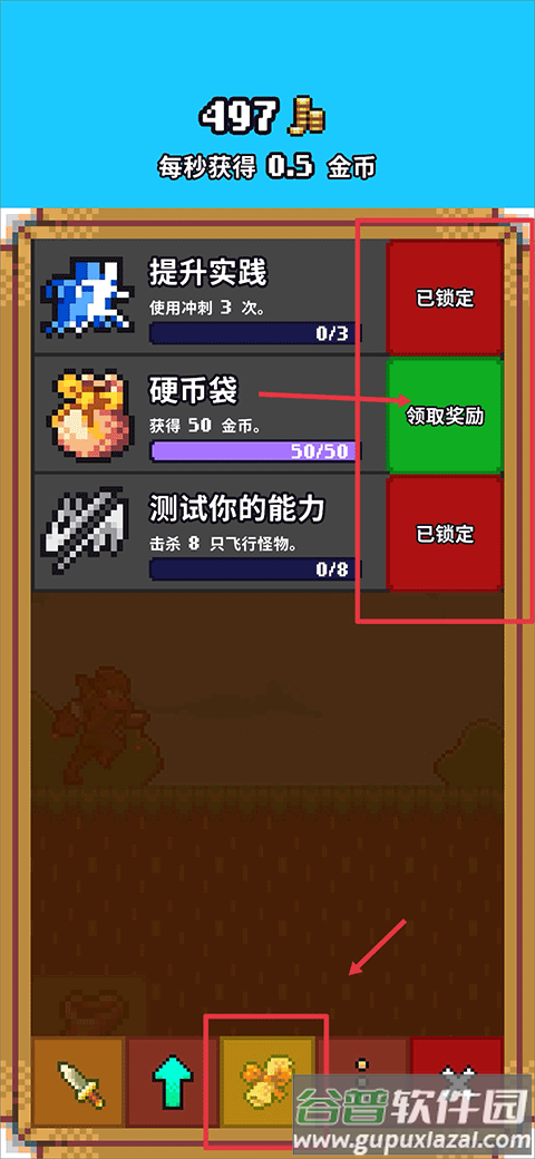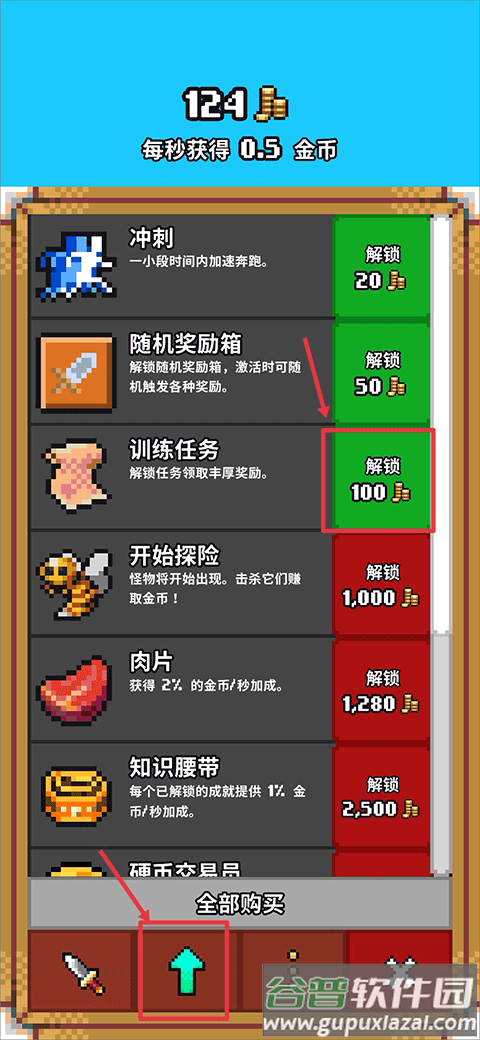 2、获得金币后点击界面右下角的钱袋图标,进入商店页面,消耗金币解锁各类任务,比如基础训练任务;