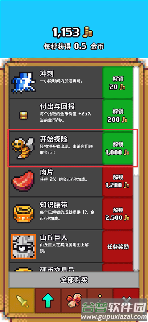 4、当金币储备达到1000单位时,会自动开启探险任务模式;
