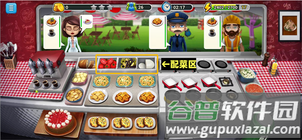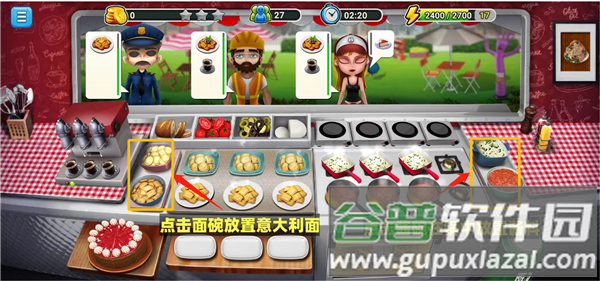 当锅中酱汁沸腾煮熟后,将其拖放到对应意面上,便完成红酱或白酱意大利面,顾客有时会要求加入番茄、奶酪、橄榄等配料,此时点击备餐区上方的配料栏,将所需配料拖入意面中即可。