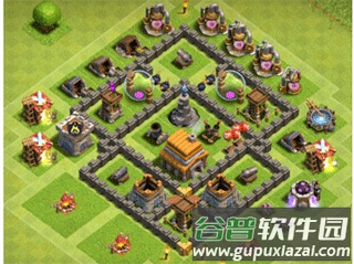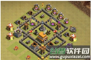 大本营置于阵型核心区域,周围布置箭塔与加农炮形成交叉火力,外层用城墙延缓进攻节奏。