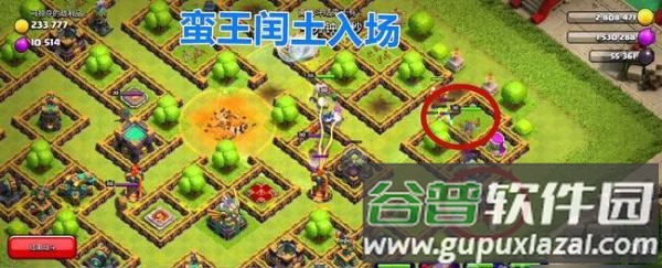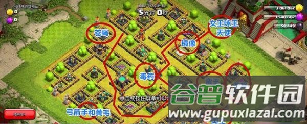 3、应对部落援军时及时施放毒药法术,蛮王带领独角兽与主力汇合。闰土从侧翼切入清除六点钟方向建筑,注意保持天使数量充足。