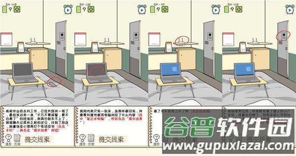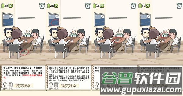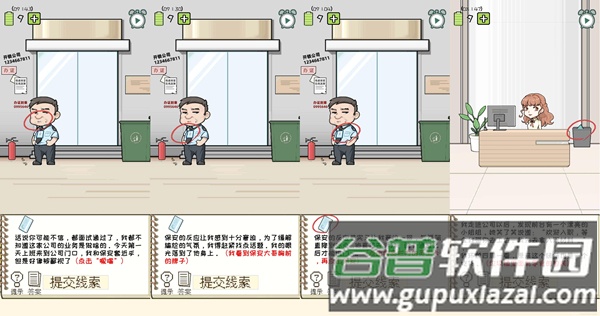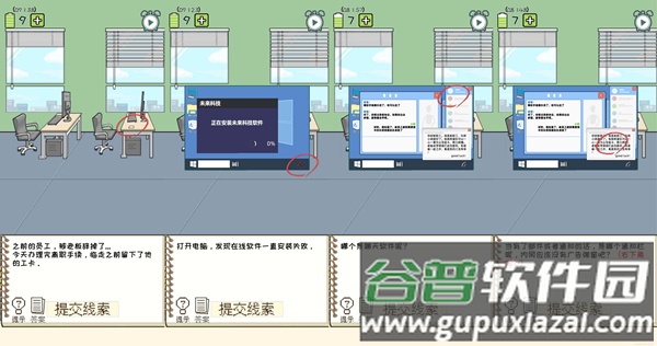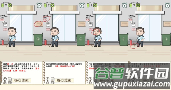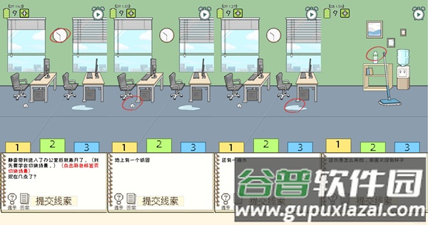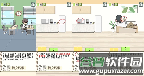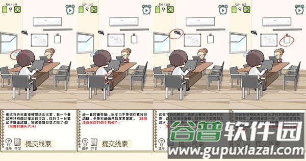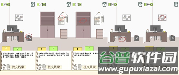 1、通过观看场景动画与解读文字提示寻找线索,每个办公区域都隐藏着与主线相关的道具与痕迹;