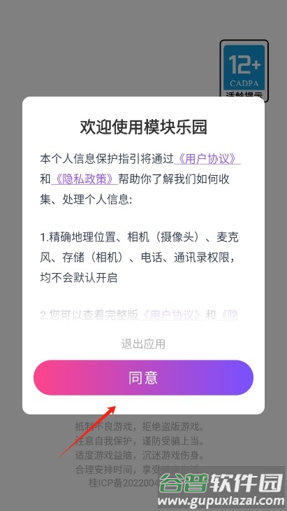 1、首先下载并安装模块乐园app,打开软件时需要同意相关用户协议;