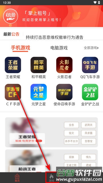 1、首先下载并打开掌上租号app,点击页面下方的游戏分类入口;