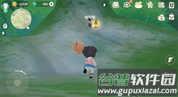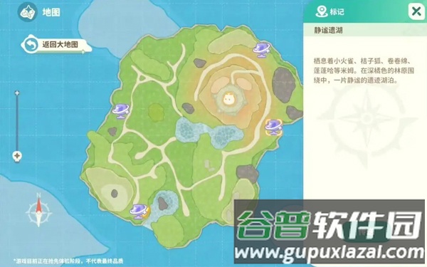 2、蛙蛙气球:打开树野小岛传送至静谧遗湖,右转视角朝地图西边的湖泊前进,降落到瀑布下方后游泳进入内部区域,在里面找到蓝色小果实,互动后即可在背包中获得蛙蛙气球;