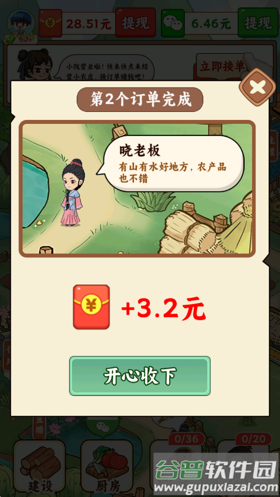 这是一款以种植经营为核心的轻松游戏,玩家通过接取客人订单来种植对应作物。完成订单后即可领取奖励,随着农场设施不断升级,还能开启牧场与鱼塘等新玩法,迎接更多类型的任务,收获更丰厚的回报。