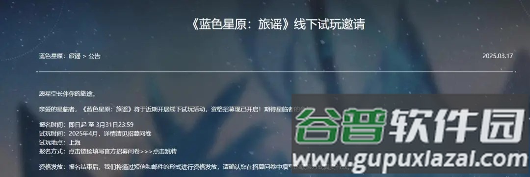 在年初获得版号后,时隔整年,《蓝色星原:旅谣》近期正式开启线下试玩招募活动。官方公告显示,本次测试将于四月在上海举行。