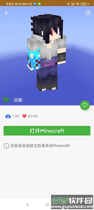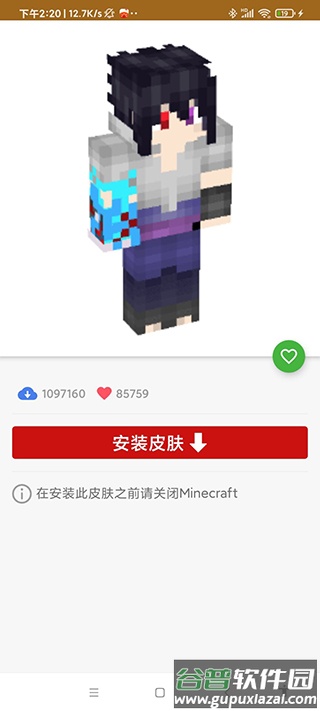 3、页面会展示该皮肤的动态效果,同时显示下载次数和收藏数量,注意在安装皮肤前需要先关闭Minecraft游戏;