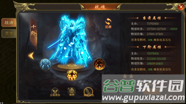 护卫:共分10阶,每阶10星。升级战魂可提升防御、生命、攻击等属性,并增加石化触发概率。战魂技能通过购买获得,能大幅强化石化效果与伤害。