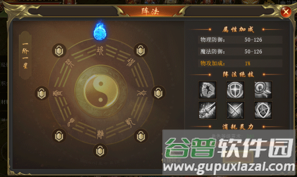 8、阵法系统共8阶,每阶10星。提升阵法等级增加攻击加成,高阶阵法解锁特殊技能。