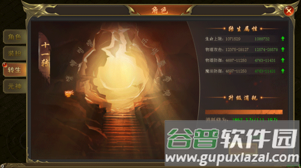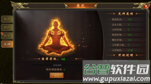元神:转生后开放元神功能,消耗元神丹提升等级。元神丹通过活动或积分商城获取。元神等级影响元神值、抵伤、恢复、攻防等属性。