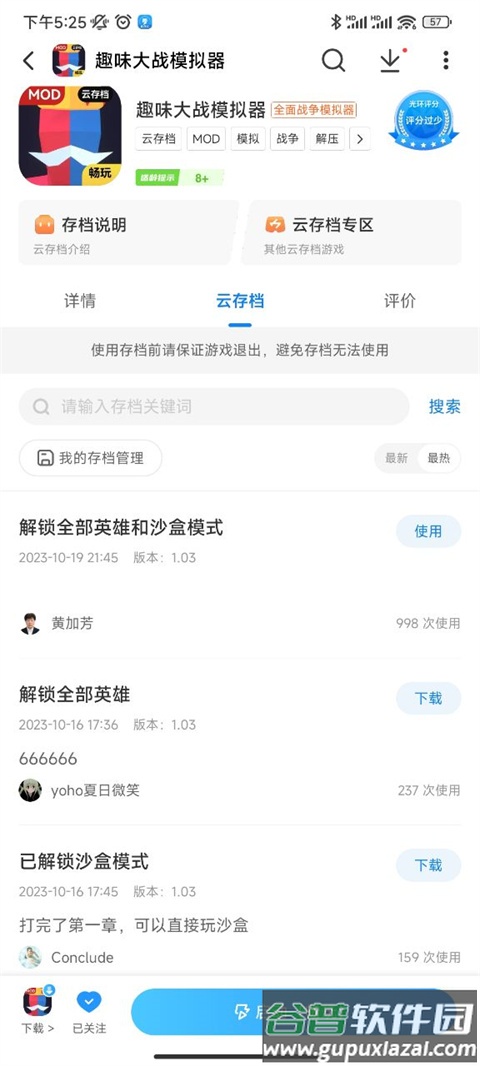 方法2:下载支持云存档的畅玩游戏后,在游戏管理列表点击游戏图标进入详情页,选择云存档标签下的存档文件,点击下载并在完成后选择“使用”,等待加载完毕启动游戏即可体验。