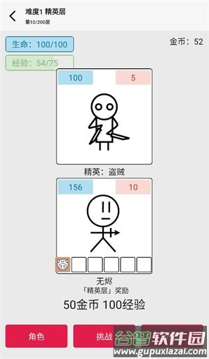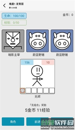 5、进入关卡后,点击前进开始冒险,每通过一关都能拿到金币与经验;