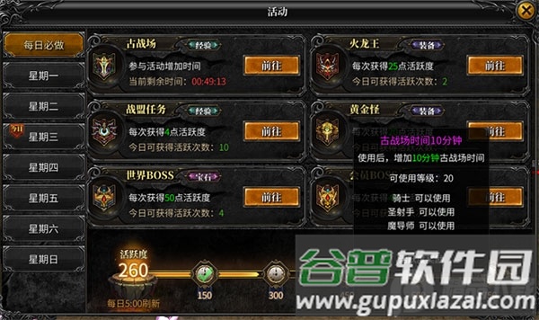 活动界面清晰展示每日玩法开放时间与规则。完成指定任务积累活跃度,可兑换古战场时长。每日最高可获得35分钟古战场时间。血色城堡与恶魔广场活动提供海量经验,配合光之祝福道具效果更佳。每轮活动可进入两次,需提前准备对应门票。