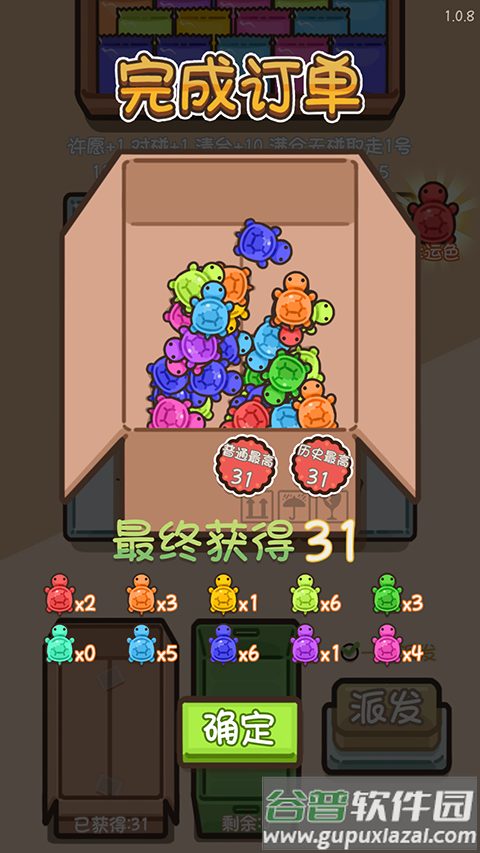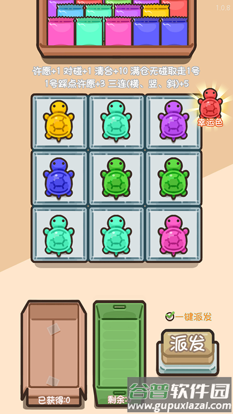 玩法设计:虽然标榜消除玩法,但实际体验较为枯燥。玩家主要通过不断点击派发按钮获取各色乌龟,相同颜色自动消除得分。整个过程随机性太强,玩家参与度明显不足。