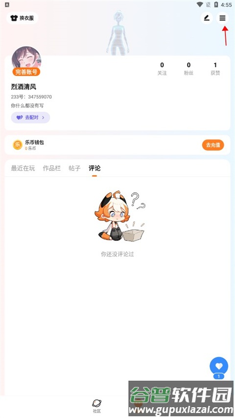1、打开233乐园,进入我的页面,点击右上角指示按钮;