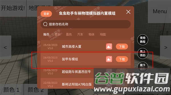 进入游戏可见绿色模组下载按钮,选择所需模组点击下载。载入游戏后暂停进程,选择新车生成功能。在车辆选项底部找到模组标签,已下载内容会显示在列表当中。选择模组后可进行颜色调整,确认后点击生成按钮完成载入。