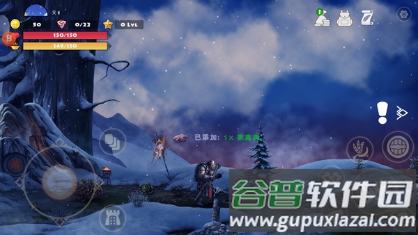 6、引导结束后正式进入游戏,采用横版移动模式,左侧虚拟摇杆控制移动,右侧按键负责攻击、释放技能与跳跃,左上角实时显示生命值与饥饿度;