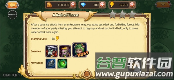 2、点击具体关卡可以查看敌方阵容信息,同时显示通关后能够获取的奖励资源;