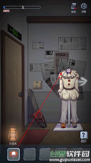 4、向右移动场景,拉开遮挡的布帘获取小丑头部道具;