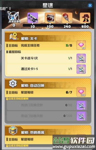 A:玩法主要通过主线任务解锁,军团等级提升也会开启新内容。具体可查看左下角星途界面,解锁新玩法还能领取钻石与积分,积分可换指挥官套装。